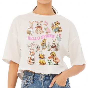 Hello Spring Cropped T-Shirt – Vintage Trendy Tee – Baby Animals Women’s Basic T-Shirt