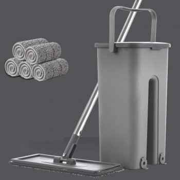 Hand-Free Flat Floor Mop and Bucket Set with Washable Microfiber Pads