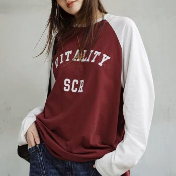 Women’s Cotton Long Sleeve T-Shirt – Burgundy Contrast Round Neck Loose Fit