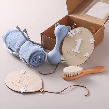 Newborn Baby Bath Towel, Cotton Blanket, Brush Set & Wooden Milestone Toy Gift Set