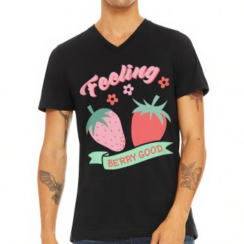 Feeling Berry Good V-Neck T-Shirt – Retro Strawberry Basic T-Shirt – Pink Graphic Tee